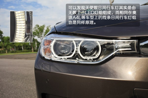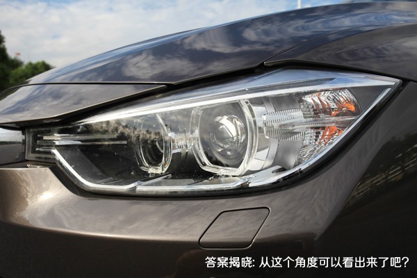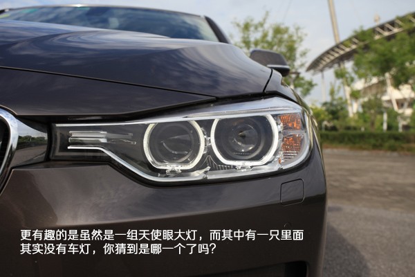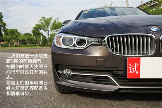 让我们更进一步欣赏新3系的前脸细节,拍摄的时候天使眼日间行车灯是打开的状态。前脸上的泊车辅助以及大灯清洗等配备也都清晰可见。双肾的造型比前作更扁平了一些。而天使眼的造型也在圆形上加入了线条元素。更为有趣的是此作3系的一个天使眼大灯中其实是没有车灯的。