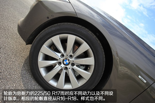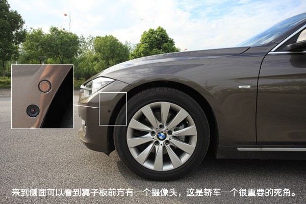 可以看到翼子板前端有一个摄像头和倒车雷达,这是轿车一个很重要的视觉死角。我们评测的这款车轮胎为倍耐力的255/50 R17轮毂,而对应不同的动力以及不同设计版本,相应的轮毂直径从R16-R18不等,样式也不尽相同。