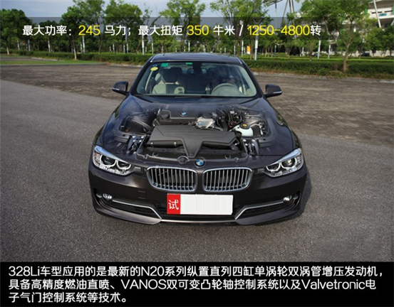 328Li车型应用的是最新的N20系列纵置直列四缸单涡轮双涡管增压发动机,具备高精度燃油直喷、VANOS双可变凸轮轴控制系统以及Valvetronic电子气门控制系统等技术。