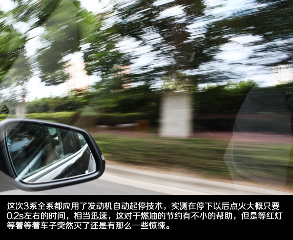 这次3系全系都应用了发动机自动启停技术,实测在停下以后点火大概只要0.2s左右的时间,相当迅速,这对于燃油的节约有不笑的帮助,但是等红灯等着等着车子突然灭了还是有那么一些惊悚。
