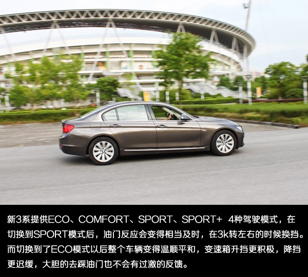 新3系提供ECO、COMFORT、SPORT、SPORT+ 4种驾驶模式,在切换到SPORT模式后,油门反应会变得相当及时,在3k转左右的时候换挡。而切换到了ECO模式以后整个车辆变得温顺平和,变速箱升挡更积极,降挡更迟缓,大胆的去踩油门也不会有过激的反馈。