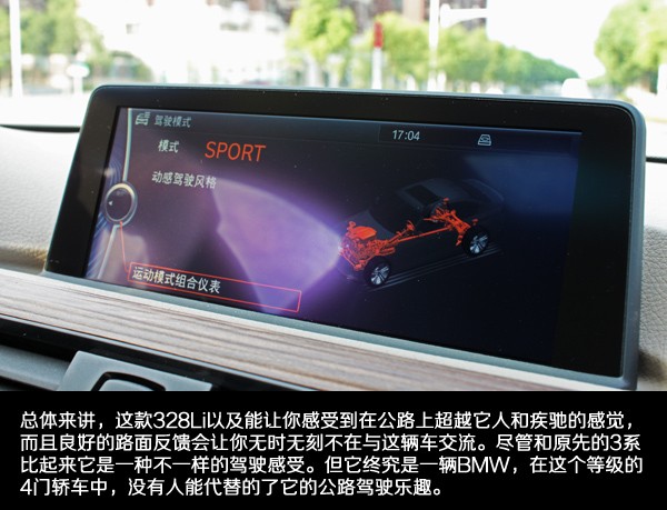 总体来讲,这款328Li以及能让你感受到在公路上超越它人和疾驰的感觉,而且良好的路面反馈会让你无时无刻不在与这辆车交流。尽管和原先的3系比起来它是一种不一样的驾驶感受。但它终究是一辆BMW,在这个等级的4门轿车中,没有人能代替的了它的公路驾驶乐趣。