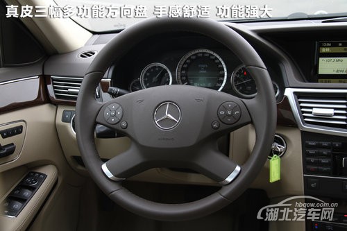 国产奔驰E200L的方向盘采用真皮包裹,所以握感出色,集成了音响按键、电话按键、定速巡航、灯光控制、方向盘调节之后驾驶者实际在驾车过程中需要实时操作的部分并不多,因为像是灯光、雨刷这些功能都是自动调节的。