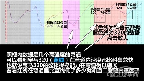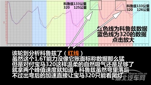 就像图上所说的,宝马320在弯内的操控能力较高,弯内可承受的极限速度也高,所以弯内速度占优势,出了弯就成了科鲁兹1.6T的天下,8.7秒的百公里加速时间必须得比宝马320那个11秒的百公里加速快非常多。于是大家就看到两个曲线鲜明的赛道图,宝马320弯里速度快,科鲁兹1.6T出了弯加速比宝马320高了那么大一截。