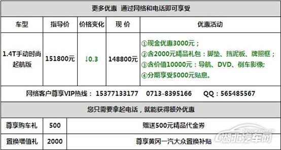 【湖北汽车网讯】黄冈一汽大众4S店速腾现车一台,超实惠导航版速腾特价贺岁献礼,现金优惠3000元,含价值10000元导航,购车即送2000元精品礼包,分期活动更享5000元贴息,如此给力钜惠小伙伴们都惊呆了,现车仅此一台,找网销销售顾问(董鹏、陈继华、雷栋)购车还有网销专项精品礼包,让全新捷达带您共同品鉴理性之选。