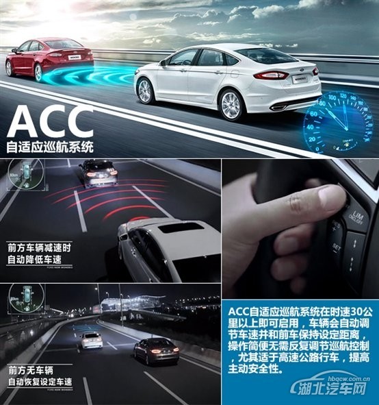 或许自动驾驶技术还不能普及,但新蒙迪欧匹配的ACC智能自适应巡航系统却可以为我们带来更轻松而又安全的驾驶体验,该系统带前向碰撞预警和碰撞缓解制动系统功能,对行车安全有着重要的意义,高速巡航时可有效防止碰撞发生,并可以自动实现巡航速度调整以保持安全和效率。