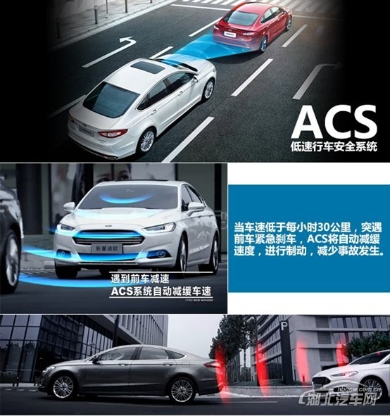 当车辆以不高于30公里/小时的速度行驶时,ACS低速行车安全系统开始启动,该系统能够自动监测车辆与前方车辆的安全情况,如系统确认两车距离太近有碰撞可能性后,制动系统进入预备状态,采取自动刹车减速甚至直接刹停,从而有效避免碰撞事故发生。