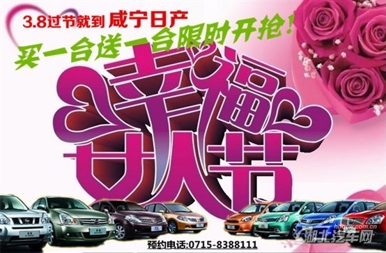 【湖北汽车网讯】编辑近日从咸宁东风日产4S店了解到,迎“三八”,3月8日当天到店购奇骏送玛驰,贷款购骐达,加100送导航,新势代奇骏火爆预定,定金1000送千元精品,全系车型更享厂价直销,二手车置换还有机会原价置换。详情请致电:0715-8388111。