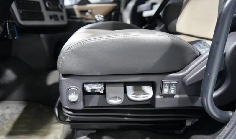 进入驾驶室,首先感受到的是其宽敞的空间布局,考虑到目前纯电动重卡的使用场景,驾驶室采用的是单卧铺设计,站立高度充足,活动空间宽裕。座椅采用气囊减震设计,支持多向调节,并配备通风加热功能,有效缓解长途驾驶疲劳。